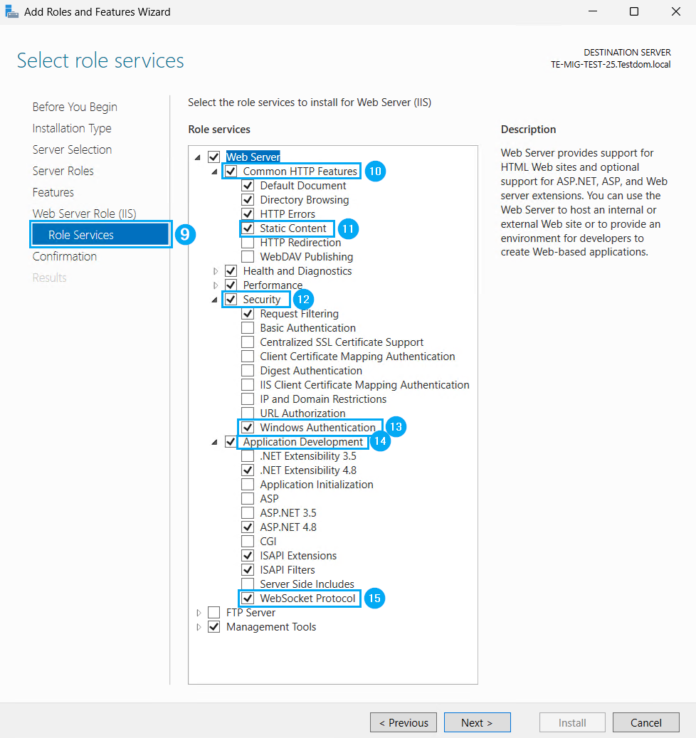 Hier stellen Sie bitte sicher, dass unter Common HTTP Features (10) Static Content (11) ausgewählt ist, aktivieren Sie unter Security (12) die Windows Authentifizierung (13) und unter Application Development (14) das WebSocket Protocol (15).