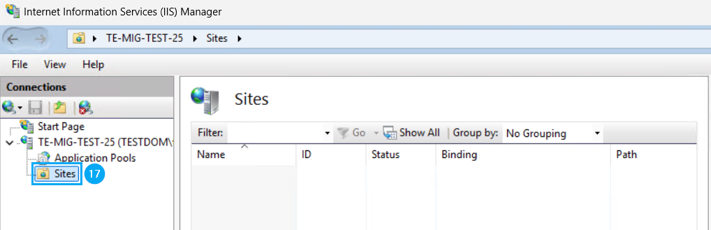 Nach Abschluss der Installation entfernen Sie unter Sites bitte die Default Website aus dem IIS, so dass der IIS Manager wie unten aussehen wird (17).